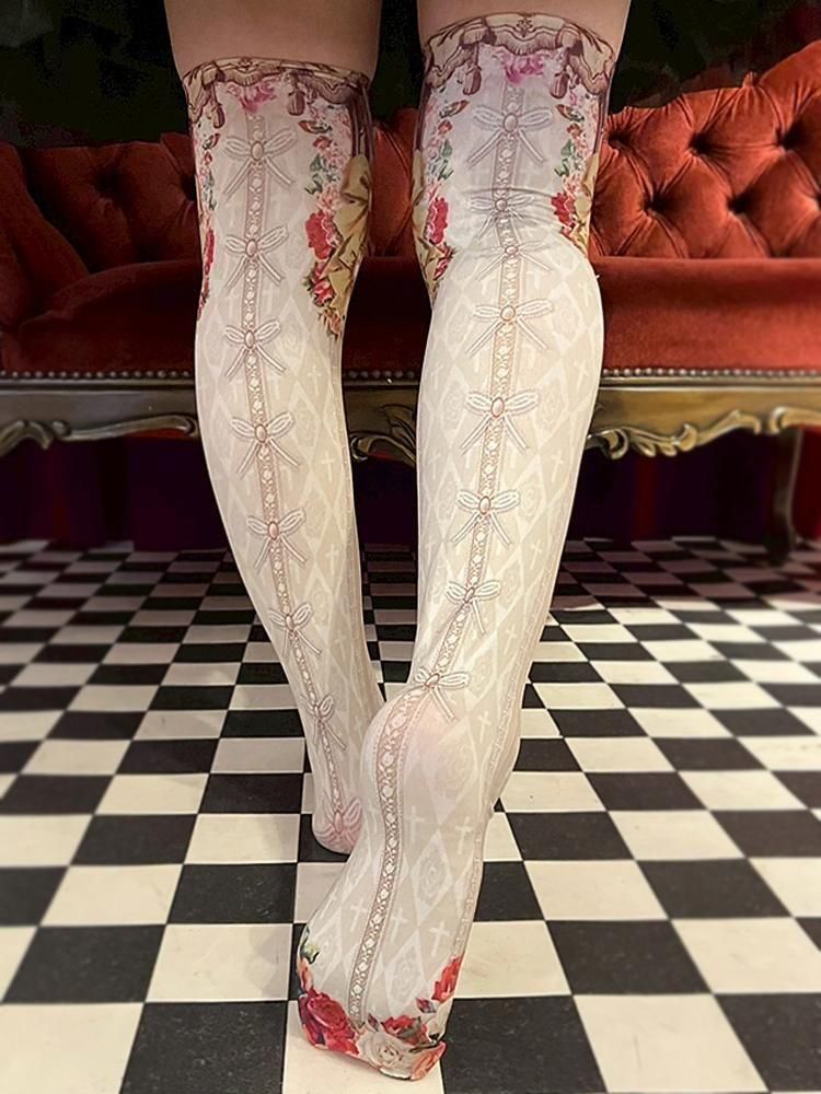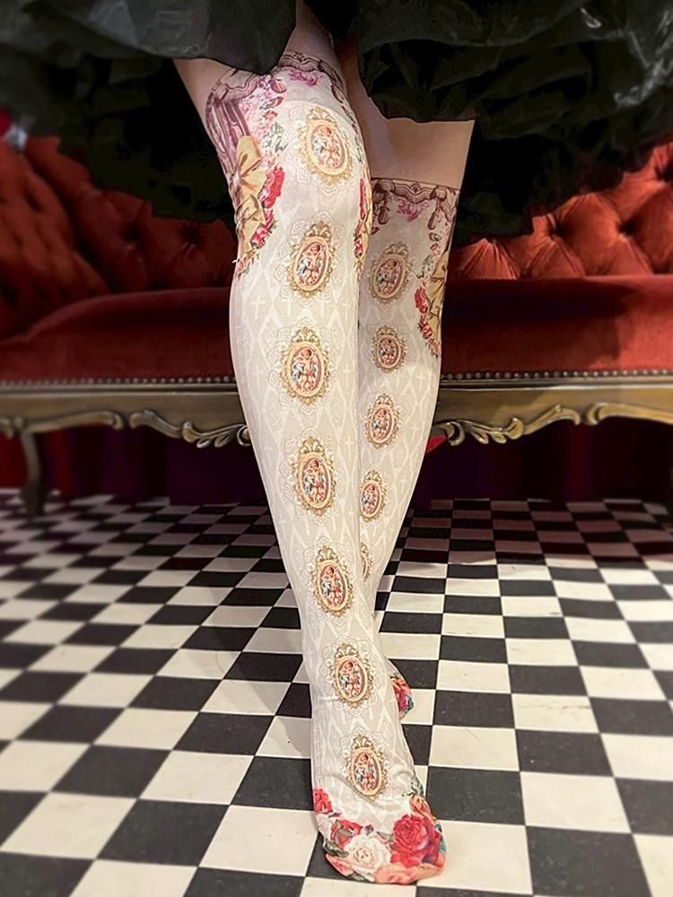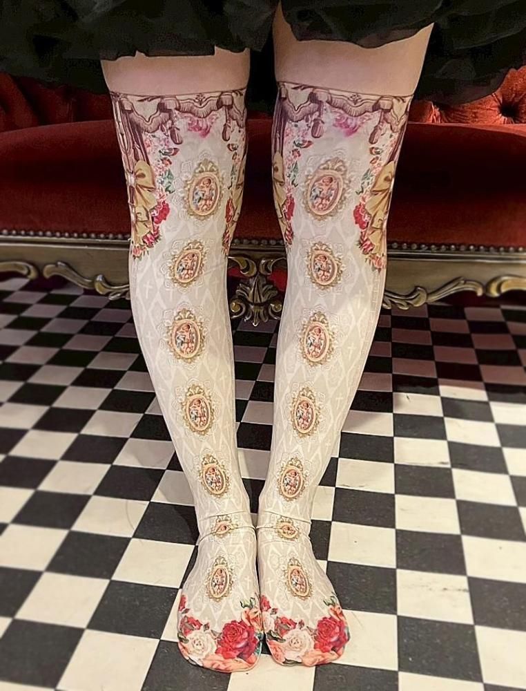 優美な絵画フレームや薔薇の装飾が足元を彩る、華やかな一足。