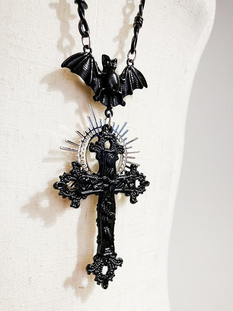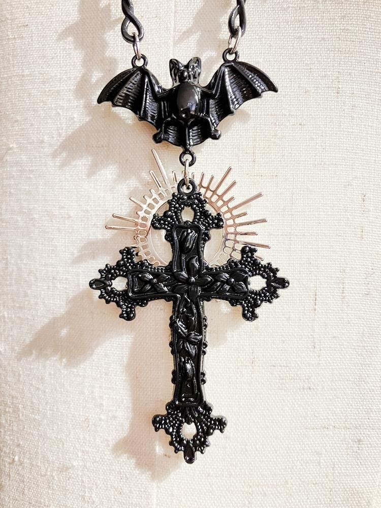コウモリのセンターパーツに大振りクロス、バックには後光モチーフが輝きます。