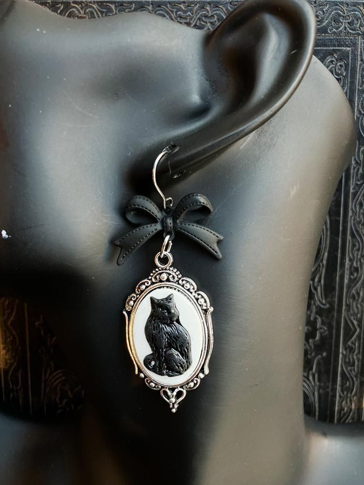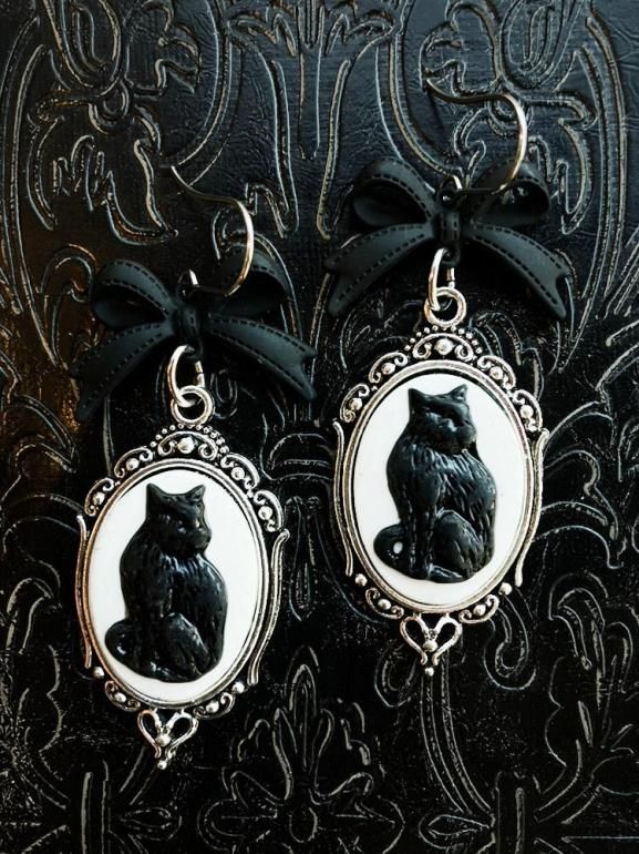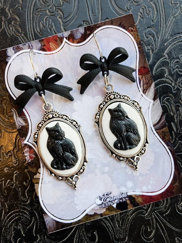 クラシカルなオーバルフレームに浮かぶ黒猫のシルエットが、耳元でミステリアスな存在感を放ちます。