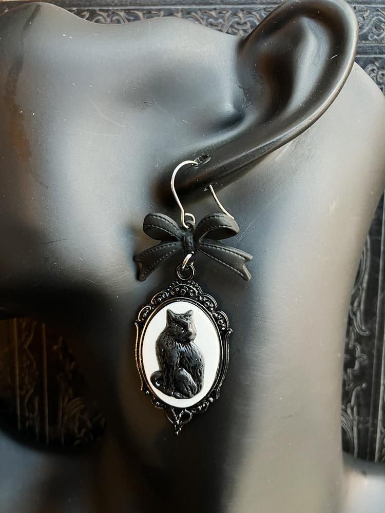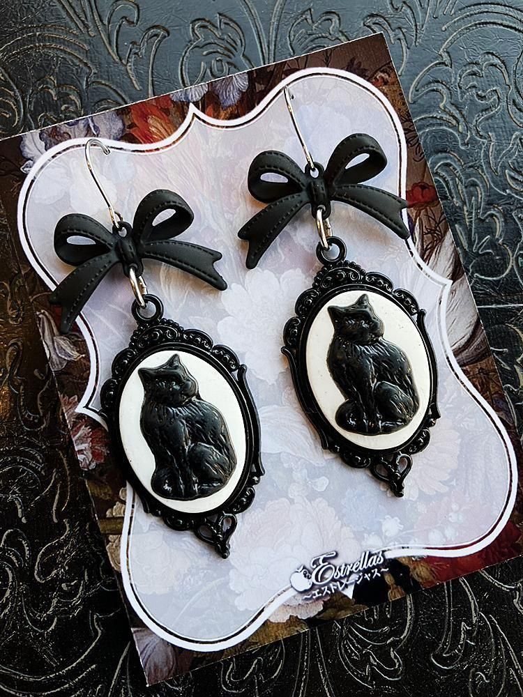 クラシカルなオーバルフレームに浮かぶ黒猫のシルエットが、耳元でミステリアスな存在感を放ちます。