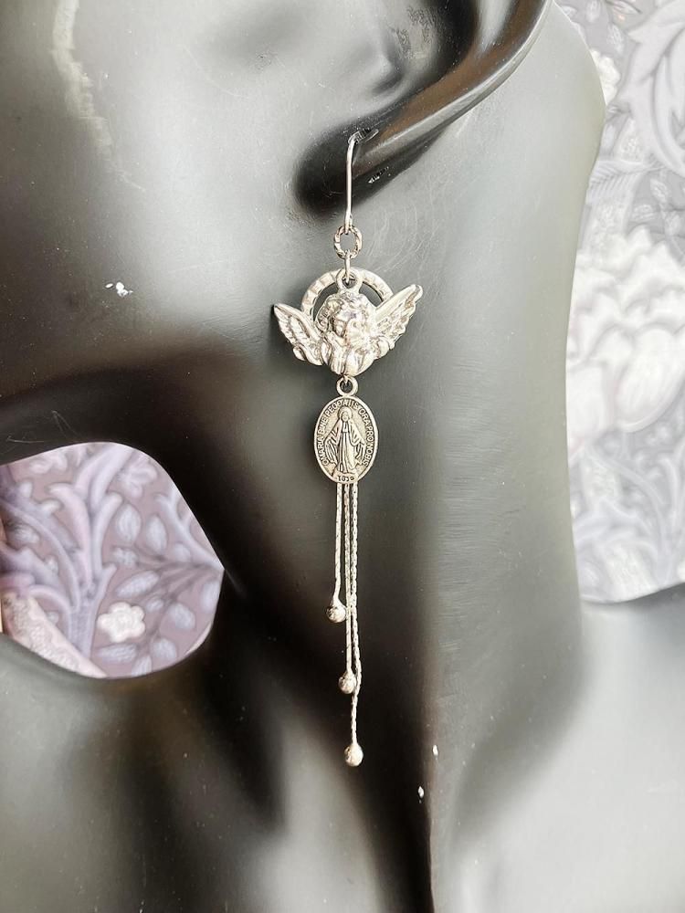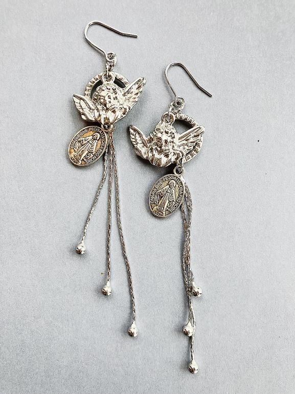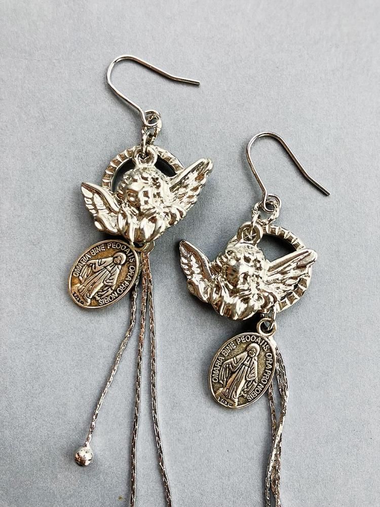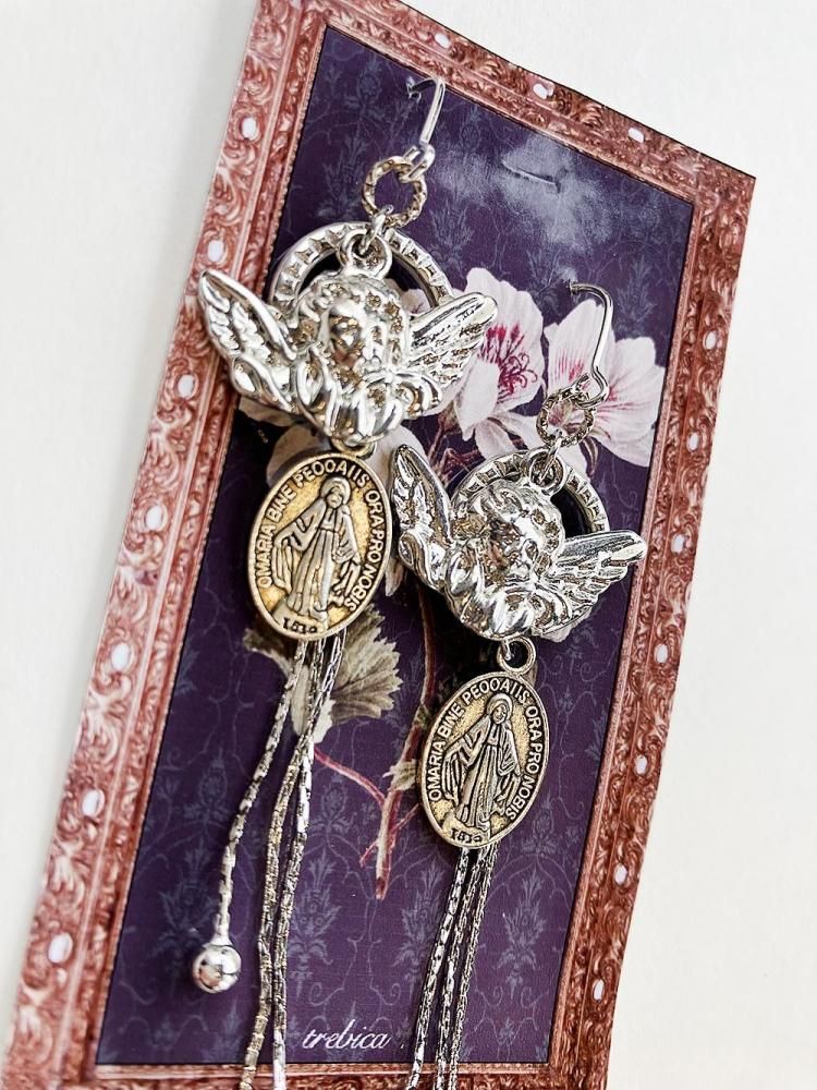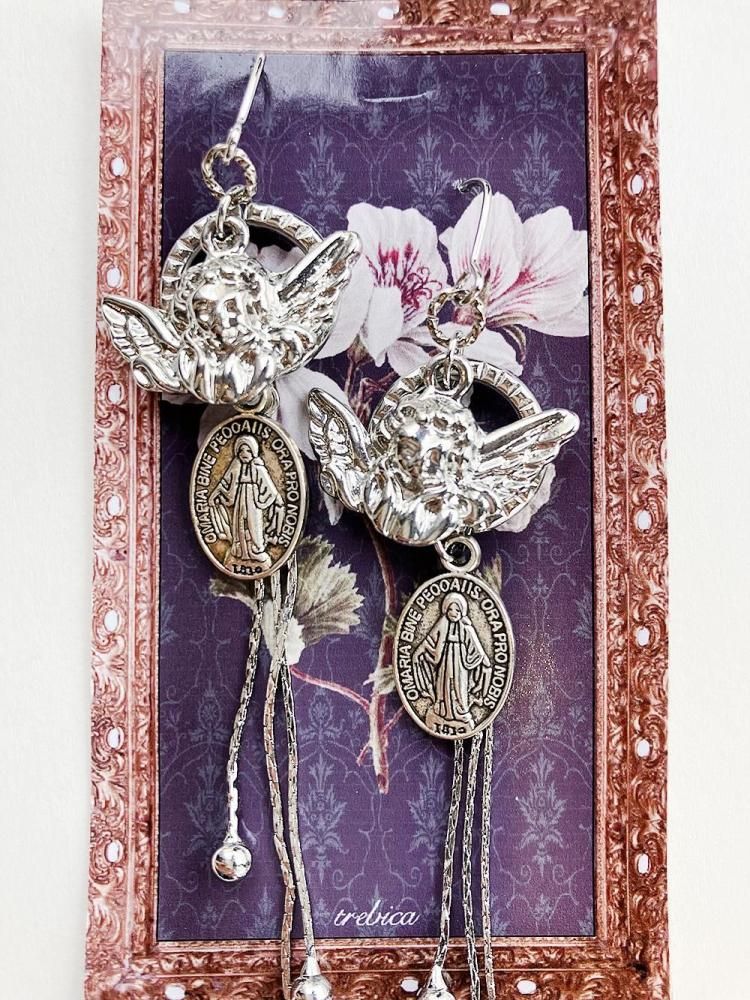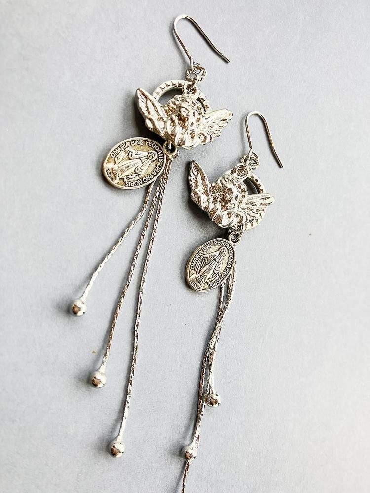 天使とメダイのモチーフに雫チェーンが揺れるピアス。